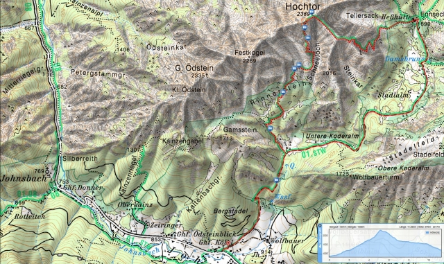 Ab dem Schneeloch auf 1800 Hm wird der Weg zunehmend schmaler, steiler und ausgesetzter! Man erklimmt Meter um Meter mit ganzem Körpereinsatz den Gipfel auf 2369m und wird mit einem herrlichen Rundumblick (Glockner, Dachstein, Grimming,...) belohnt. Der Abstieg in ähnlicher Schwierigkeit erfolgt dann dem Grad entlang und über den gut versicherten Josefinensteig abwärts zur Hess-Hütte ( 1700m). Danach vollendet man die Runde über den Wanderweg zurück zum Ausgangspunkt durch leicht kopiertes Gelände und märchenhafte Almenlandschaft und Waldabschnitte.
