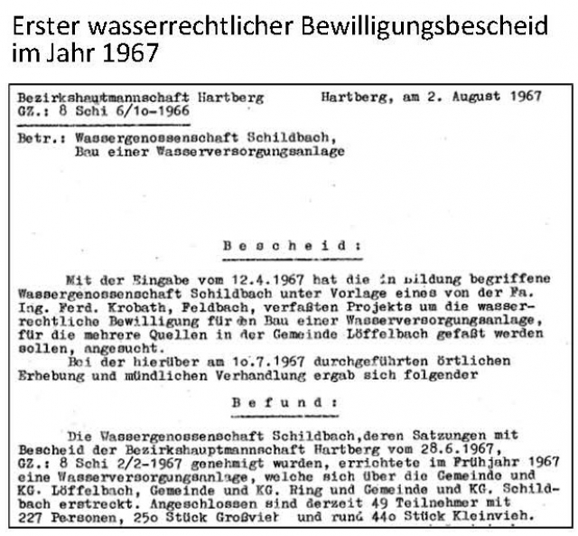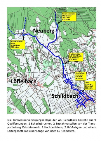 Die Trinkwasserversorgungsanlage der WG Schildbach besteht aus 9 Quellfassungen, 2 Schachtbrunnen, 2 Entnahmestellen von der Transportleitung Oststeiermark, 2 Hochbehältern, 2 UV-Anlagen und einem Leitungsnetz mit einer Länge von über 15 Kilometern.
