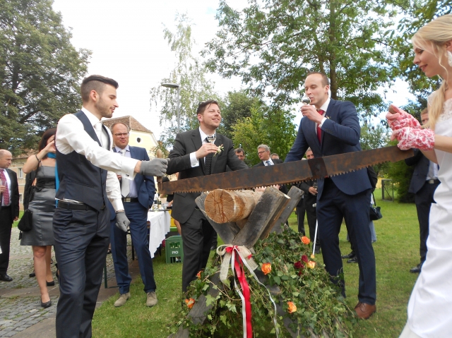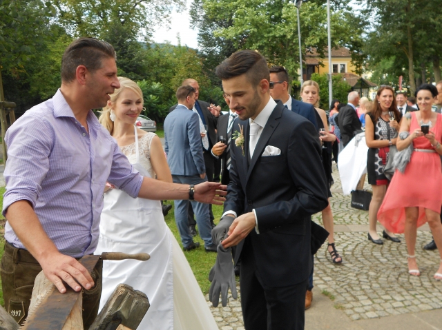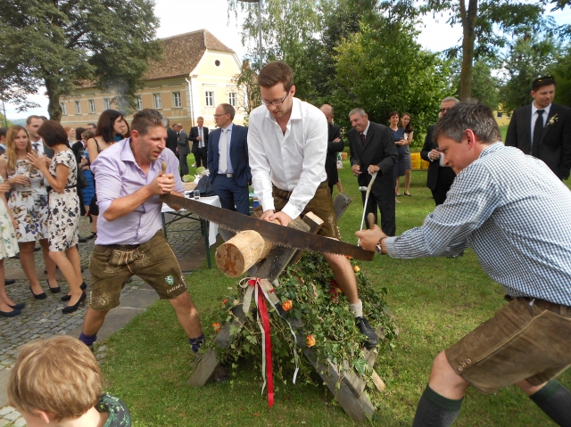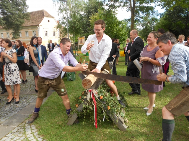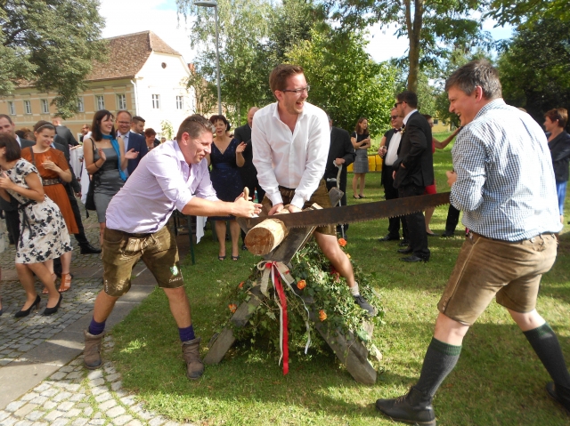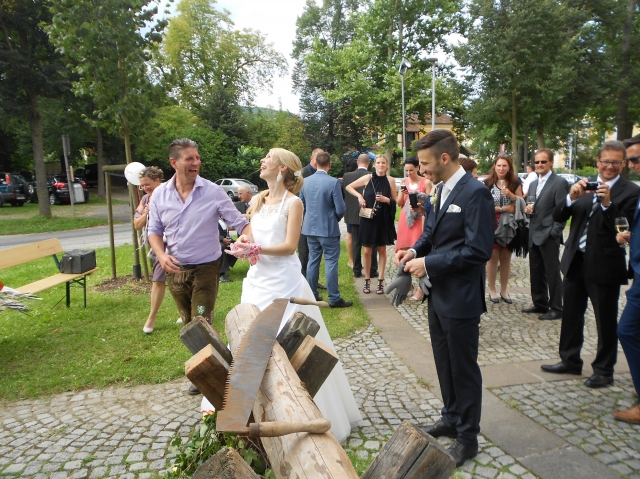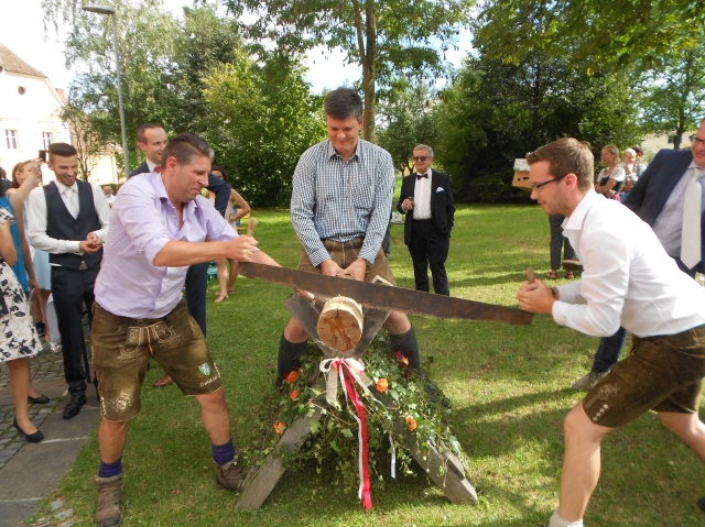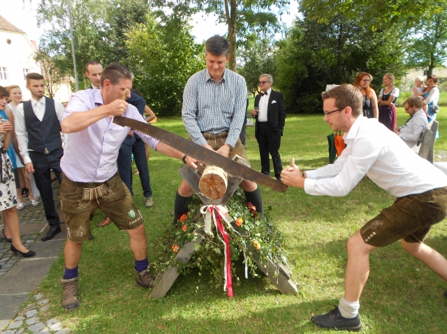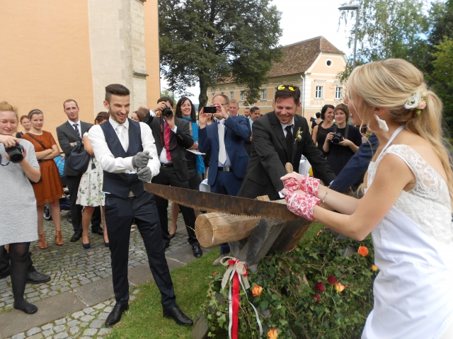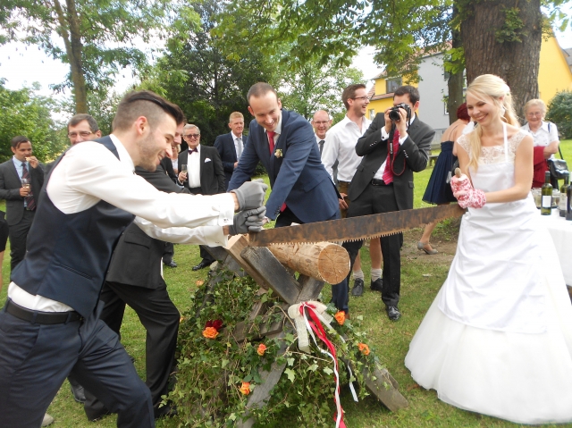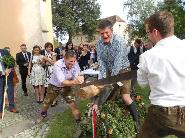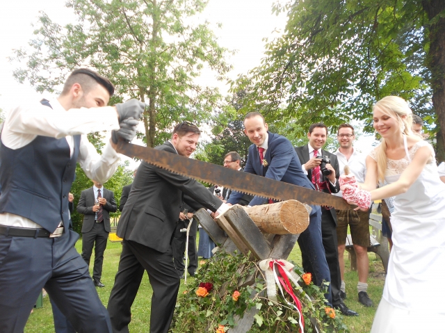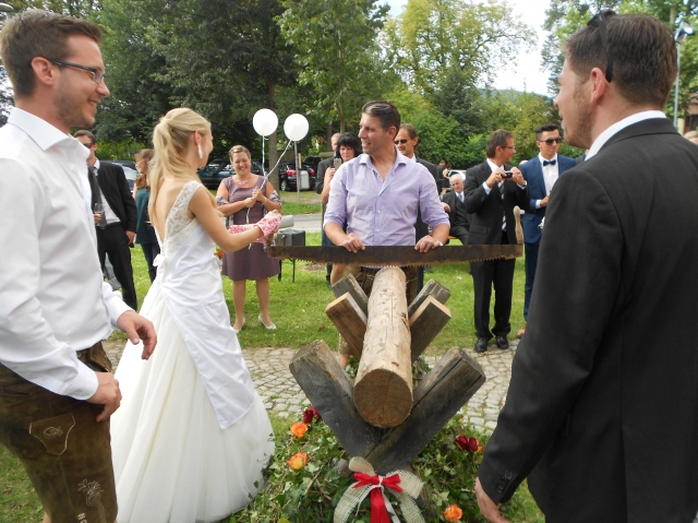 Der Kulturverein machte dem Paar nach der Trauung seine Aufwartung und kam der Tradition des Baumstammschneidens nach.