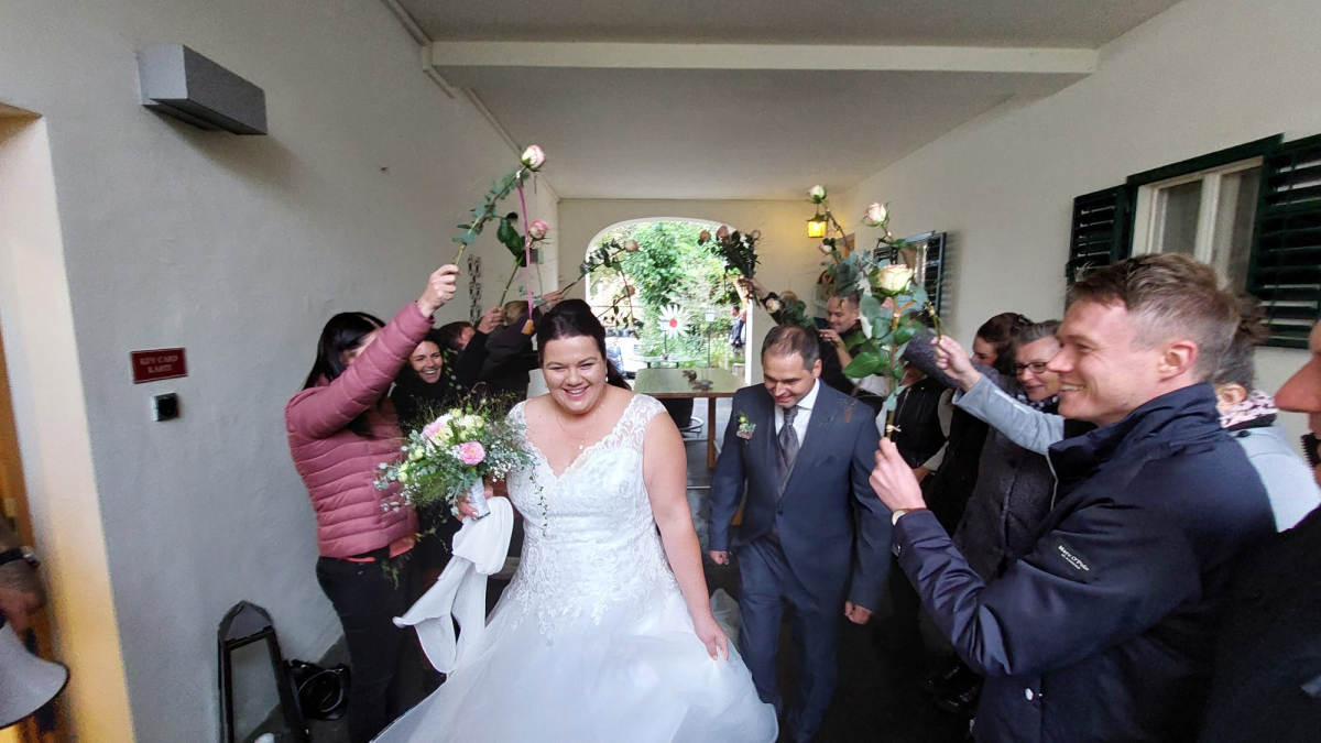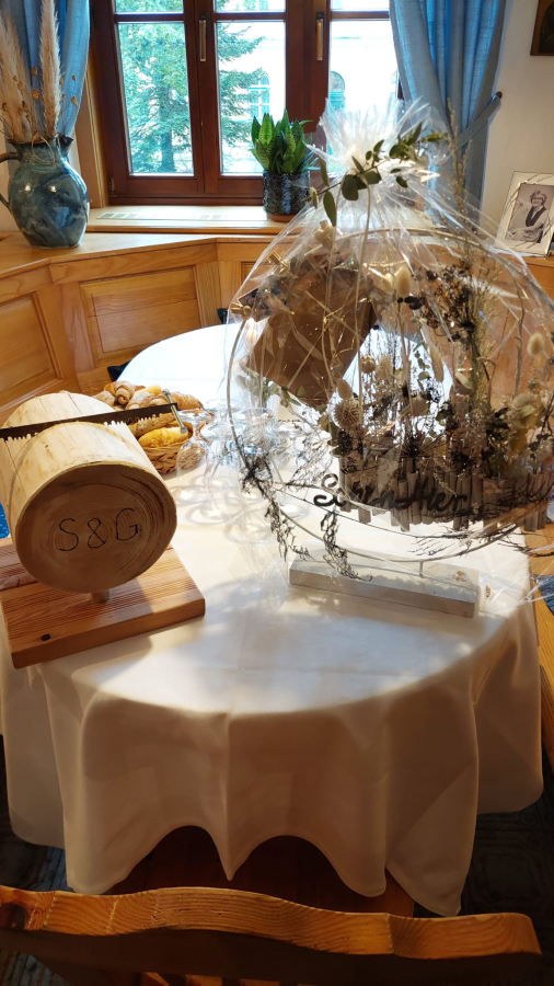 Die Dorfgemeinschaft machte dem Paar nach der Trauung seine Aufwartung und wollte der Tradition des Brautbaumschneidens nachkommen. Aufgrund des widrigen Wetters musste dieser schöne Brauch leider abgesagt werden und so kamen wir mit einem Teil des Brautbaums zum Gratulieren.